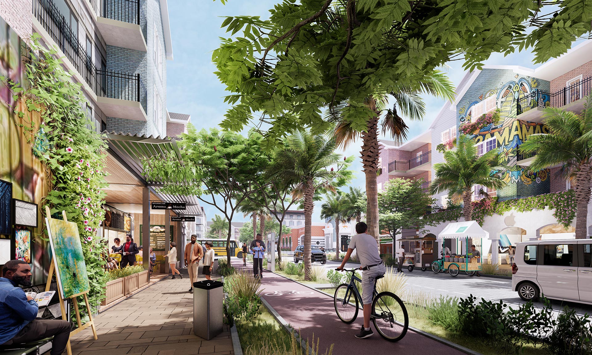 We developed the design for a new beachside city where we prioritized walkability and climate resilience. The goal was to provide the area with a new center that prioritized pedestrian access and offered a pleasant microclimate, while at the same time, offering protection against storm surges and raising sea levels.